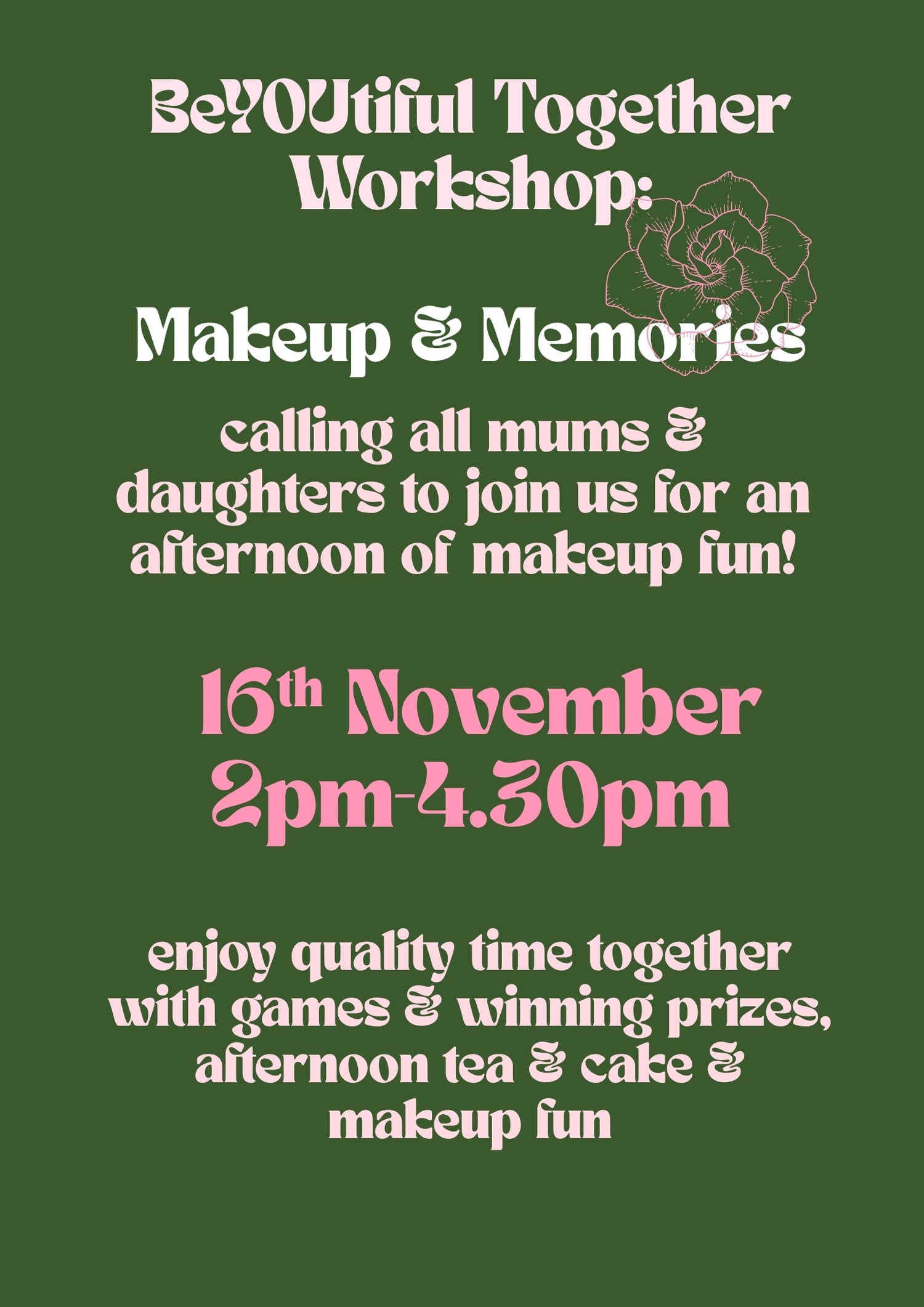 Our BeYOUtiful Together Workshops focus on relationships & having fun together. We are having our second workshop on 9th November 2025 & it is for mums & daughters of any age to come together & spend an afternoon enjoying our makeup & skincare together whilst also joining in fun games & afternoon tea & cake!